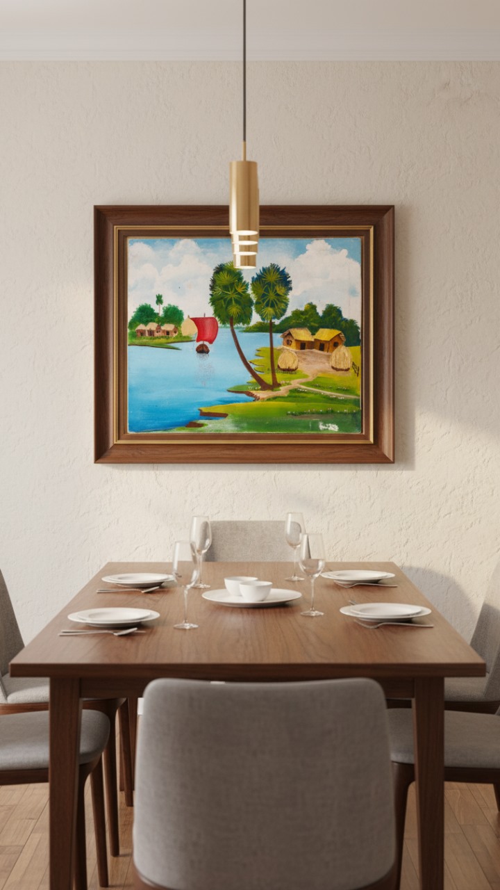 Bring warmth, elegance, and cultural charm into your home with this beautifully hand-painted Bangladeshi village landscape. Featuring a calm riverside view with traditional huts, tall palm trees, lush greenery, and a vibrant red sailboat, this artwork captures the peaceful beauty of rural life. The bright blue water and soft natural colors create a soothing atmosphere, ideal for enhancing any dining room, living space, or office.